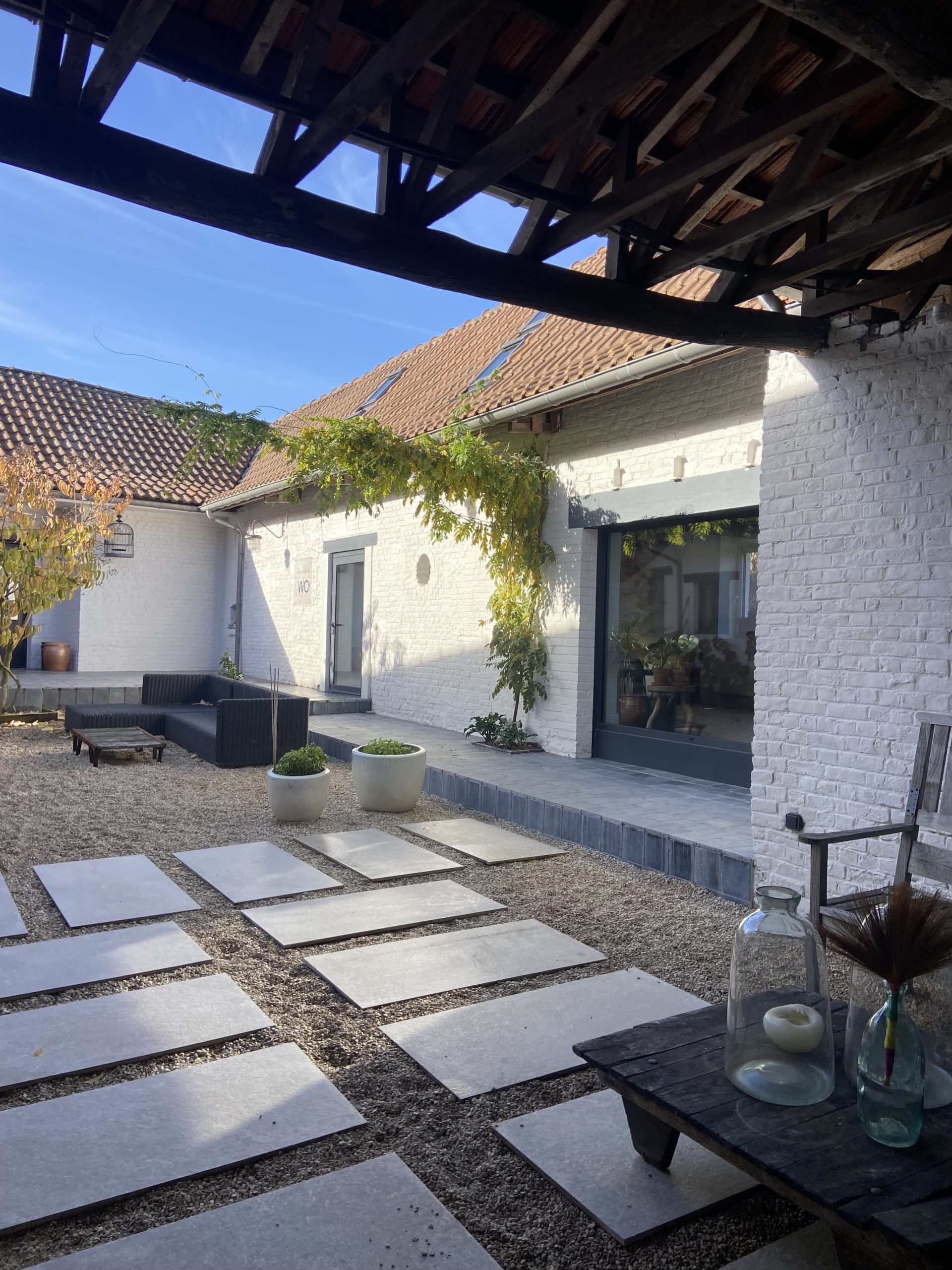 Au cœur de la Pévèle, cette ancienne fermette restaurée allie authenticité et sérénité. Vous entrez par la cour de briques blanches et de pierres bleues, offrant une atmosphère minérale et chaleureuse. Ou bien, accéder par le parking pouvant accueillir une quinzaine de voitures, situé côté jardin.