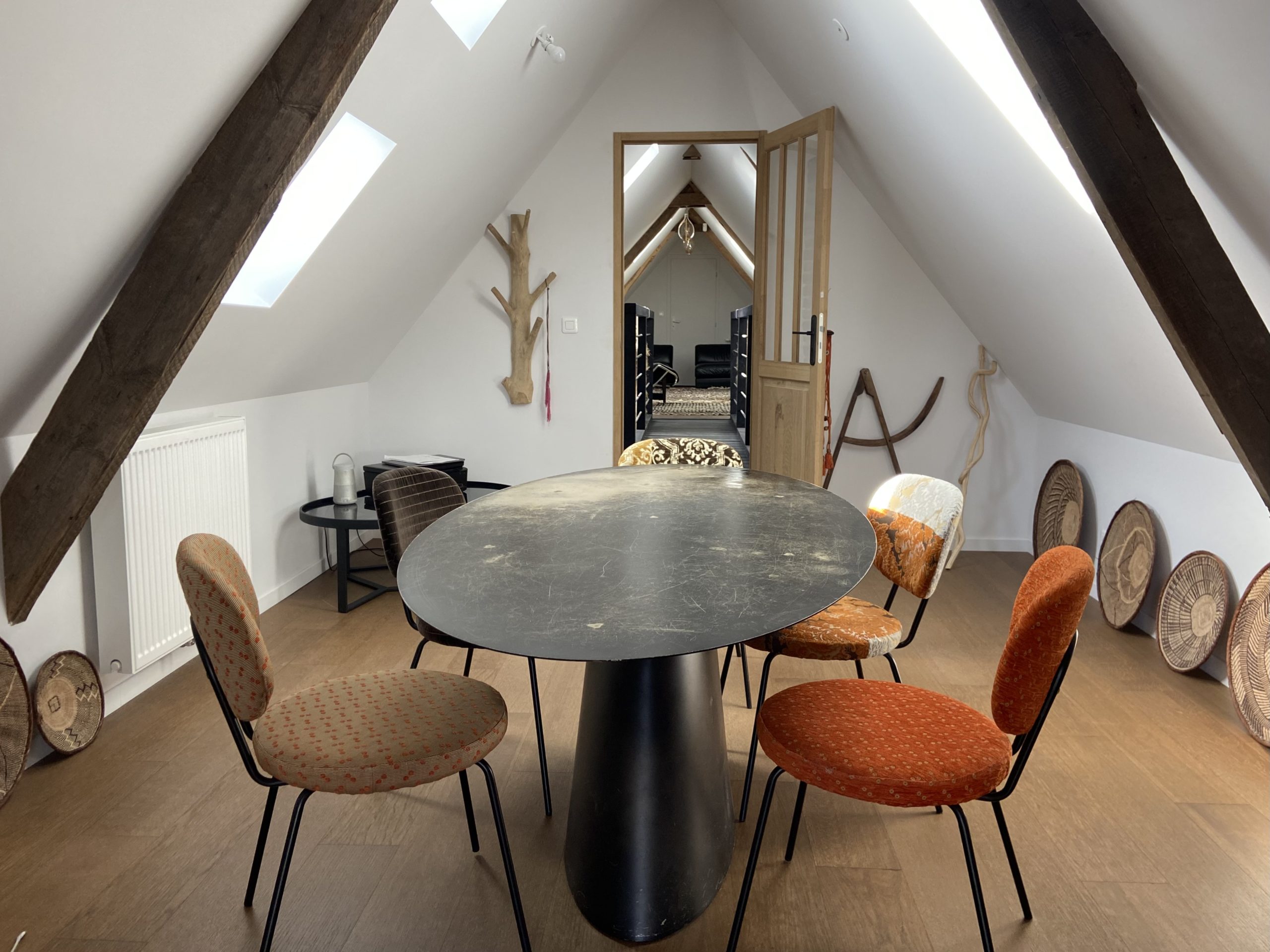 Au cœur de la fermette, une grande salle de 70 m² baignée de lumière. Un esprit authentique, entre murs de briques, poutres apparentes et larges ouvertures sur l’extérieur, en fait un espace propice à la réflexion et à la créativité. Un escalier en bois mène à une salle de réunion mansardée avec balcon, prolongée par une passerelle vers un espace salon/repos intime et chaleureux.